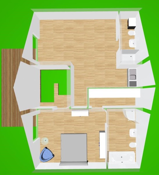 Ebenso wäre auch eine Teilung des Hauses in 3 WGen möglich.