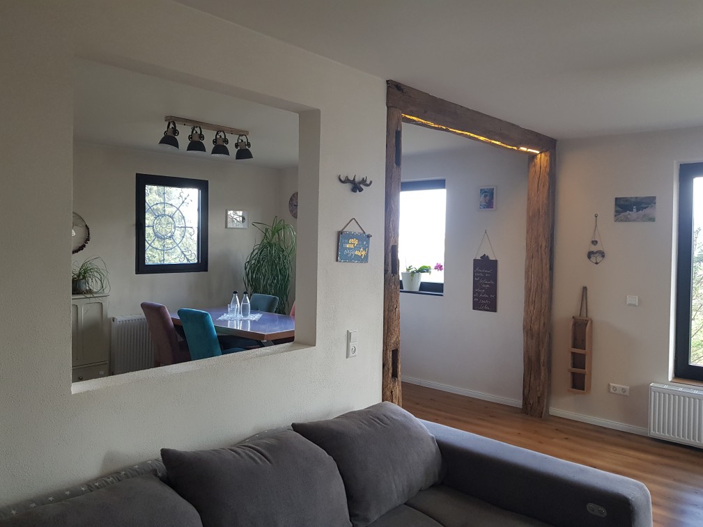 Die Immobilie besticht nicht allein durch die Lage und deren einmalige Aussicht, sondern auch durch den besonderen Siedlungshausstil. Das EG, das durch einen Kaminofen gemütlich erwärmt wird, verfügt über eine Diele mit Gäste-WC, Küche, großer offener Wohn- und Essbereich, einem Schlafzimmer und einem Panorama- Wintergarten. Die ersten Sonnenstrahlen können in dem unbeheizten, völlig aus Glas bestehenden, Wintergarten eingefangen werden. Vom Wintergarten aus gelangt man zum Schmuckstück des Hauses, die Terrasse. Der offene Wohnbereich ist durch eine Durchreiche mit der neuen Einbauküche verbunden. Durch die großen Fensterflächen sind die Räume hell und lichtdurchflutet. Von der Diele aus gelangt man über die Kellertreppe in den Keller oder in das OG. Das OG verfügt über 2 Zimmer, über ein großes modernes Badezimmer, einen Balkon und über einen Abstellraum. Von dort aus gelangt man auf den ausgebauten Dachboden. Das Dachgeschoss bietet dabei einen weiteren großen Bereich, der als Kinder-/Arbeitszimmer genutzt werden kann. Der rückseitige Bereich des Gartens verfügt über eine geräumige Garage + Gartenhaus.