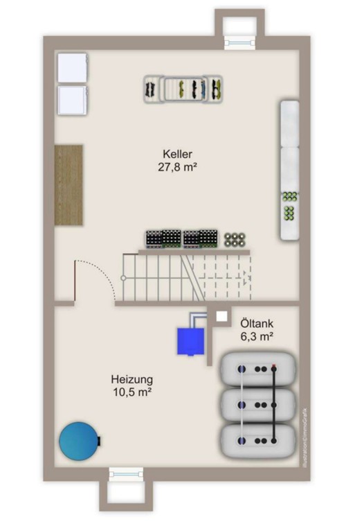 - Geschoße: KG + EG + OG + ausgebautes DG
