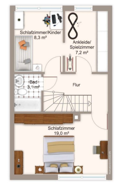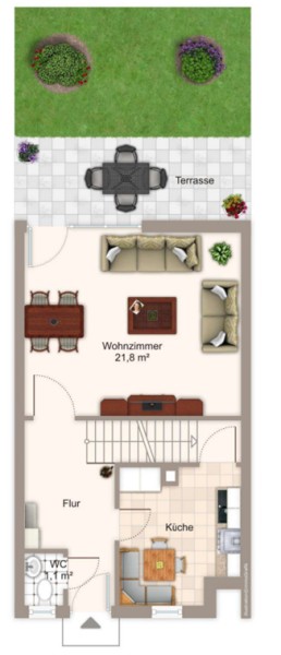 Das Reihenmittelhaus erstreckt sich über eine Gesamtwohnfläche von etwa 110 m² und steht auf einem nach Süden ausgerichteten Grundstück mit circa 127 m².