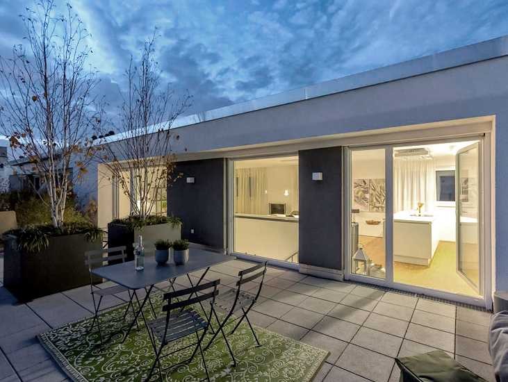 Der separate Hauseingang, die individuelle Hausnummer, die private Wärmepumpe sowie die separate Wasserzuleitung und Stromversorgung betonen den Anspruch auf Exklusivität, Individualität und Privatsphäre und sind Sinnbild der architektonischen Besonderheit dieser Duplex-Dachterrassenwohnung.