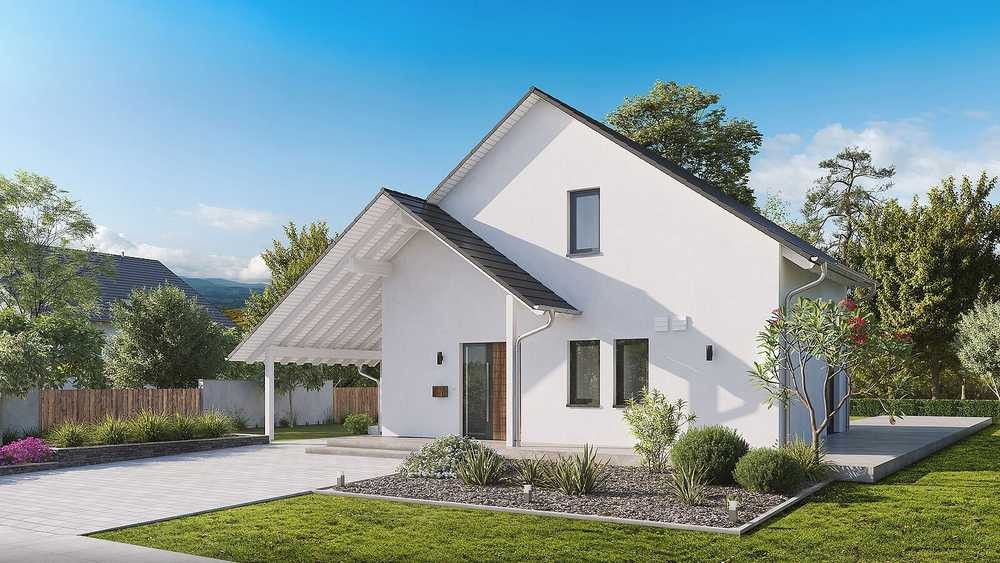 Das elegante Einfamilienhaus verfügt über ein Satteldach mit Schleppdach, welches sich ideal als Carport bzw. Stellplatz für ein Fahrzeug eignet.