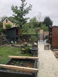 Zu dem Haus gehört ein kleiner Garten. und eine überdachte Terrasse.