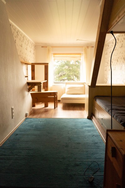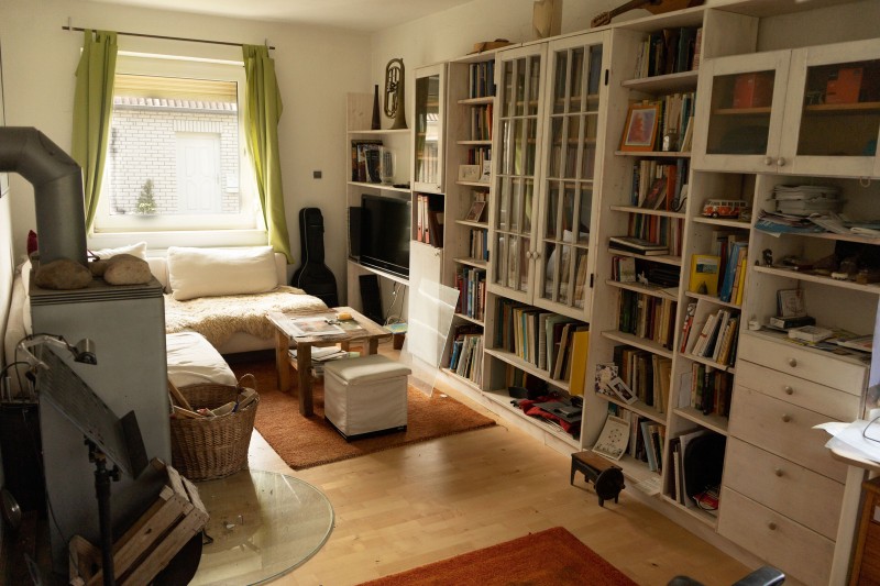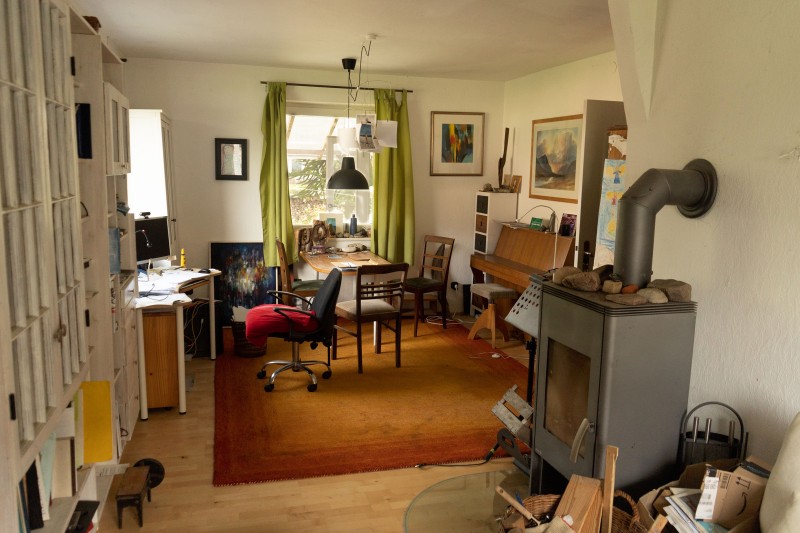 Im Erdgeschoss des Hauses befinden sich das Wohnzimmer mit einem Wamsler-Kaminofen, eine Küche und ein Gäste-WC.