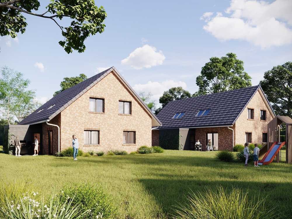 In sehr guter Anbindung an die B5 und somit nach Husum, Bredstedt, Niebüll oder zur Nordsee, entstehen zwei stilvolle Doppelhäuser mit jeweils 2 Wohneinheiten: