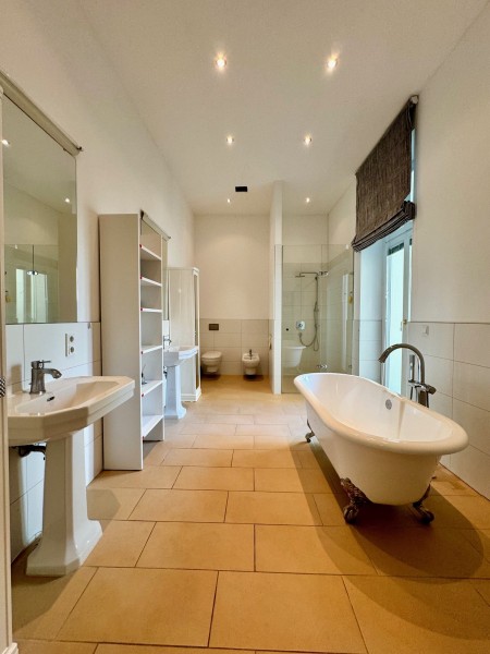 In dem außerordentlich großen, lichtdurchfluteten Hauptbad befindet sich eine freistehende Badewanne mit Blick in den Garten.