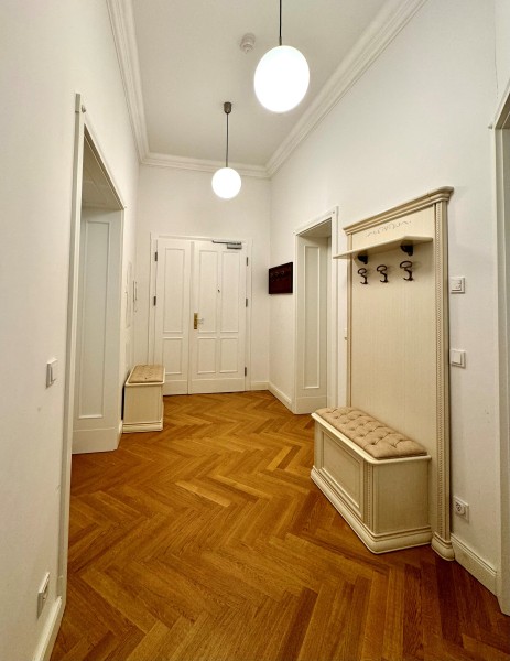 Die gesamte Technik kann über ein iPad gesteuertes BUS-System bedient werden. Die Wohnung besticht durch 4,10 m hohe Decken, französische bodentiefe Holzfenster und gusseiserne Balkone in Sonderanfertigung.