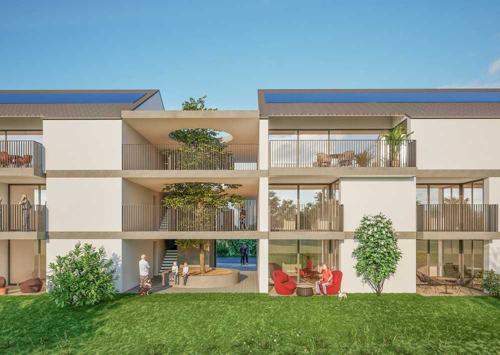 Dieses einladende Zuhause, bestehend aus zwei architektonisch ansprechenden Baukörpern, die insgesamt 16 attraktive Wohndomicile beherbergen. Herzstück der beiden miteinander verbundenen Häuser bildet die Gemeinschaftszone im Erdgeschoss. Sie stellt zum einen den Hauptzugangsbereich dar und fungiert zugleich als Begegnungsort für die Bewohner.