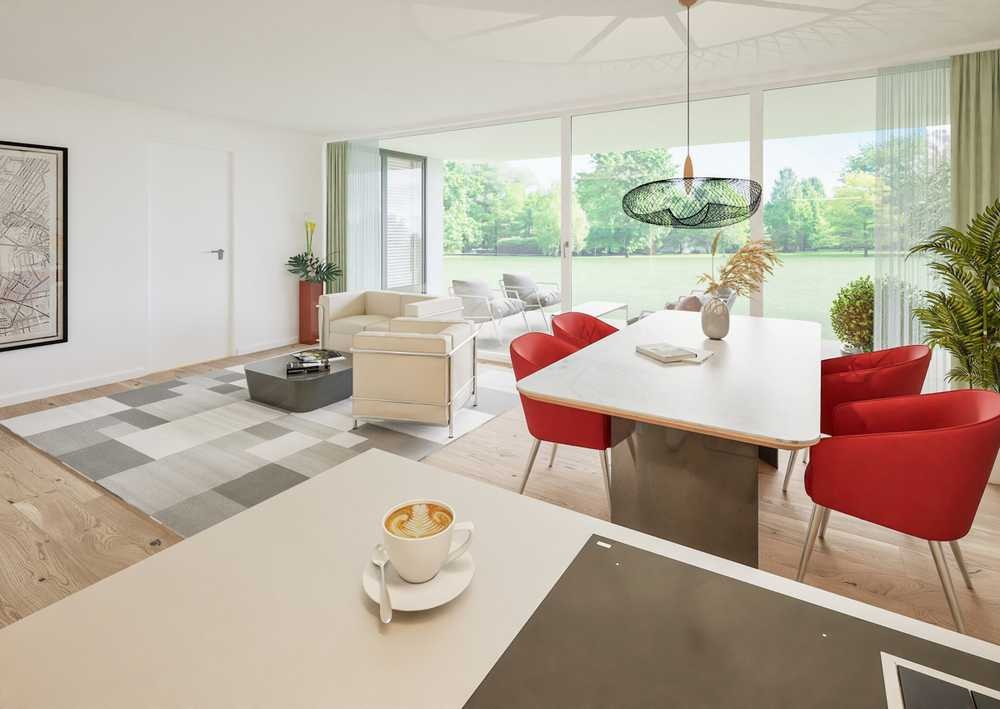 Die gehobene Innenausstattung mit stilvoll gewählten Materialien und Ausstattungselementen lassen hier keine Wünsche offen. Hochwertige Eichen-Parkettbodenbeläge, Fußbodenheizung, elektrische Alujalousien sowie bodentiefe Fensterfronten mit Schiebetürelement schaffen auffallend helle, lichtdurchflutete Räume mit Flair. Großzügige Freisitze sowie private Wohngärten eröffnen zudem im Außenbereich attraktive Entfaltungsmöglichkeiten - gepaart mit einem herrlichen Blick ins Grüne wird Ihnen hier eine ganz besondere Lebensqualität geboten. Die Ausrichtung sämtlicher Wohnungen nach Westen gewährleistet eine perfekte Besonnungssituation, die Ihnen herrliche Sonnenstunden bis in den Abend garantiert.