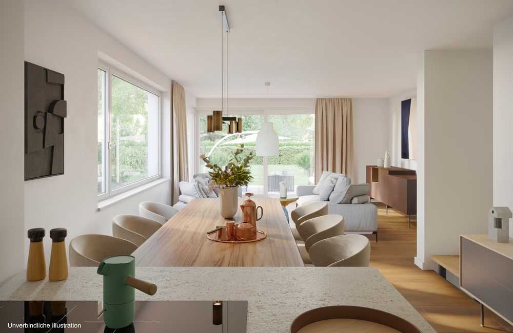 Weil die Häuser inmitten von schönen Gärten stehen, fällt der Blick stets ins Grüne. Aus dem Erdgeschoss tritt man auf seine Terrasse mit Garten. Alle Terrassen schauen nach Südwesten und kommen so in den Genuss besonders vieler Sonnenstunden. Bei einem gemütlichen Frühstück auf der Terrasse kann der Blick über den Garten schweifen oder grillen Sie mit Freunden, während die Kinder im Garten spielen.
