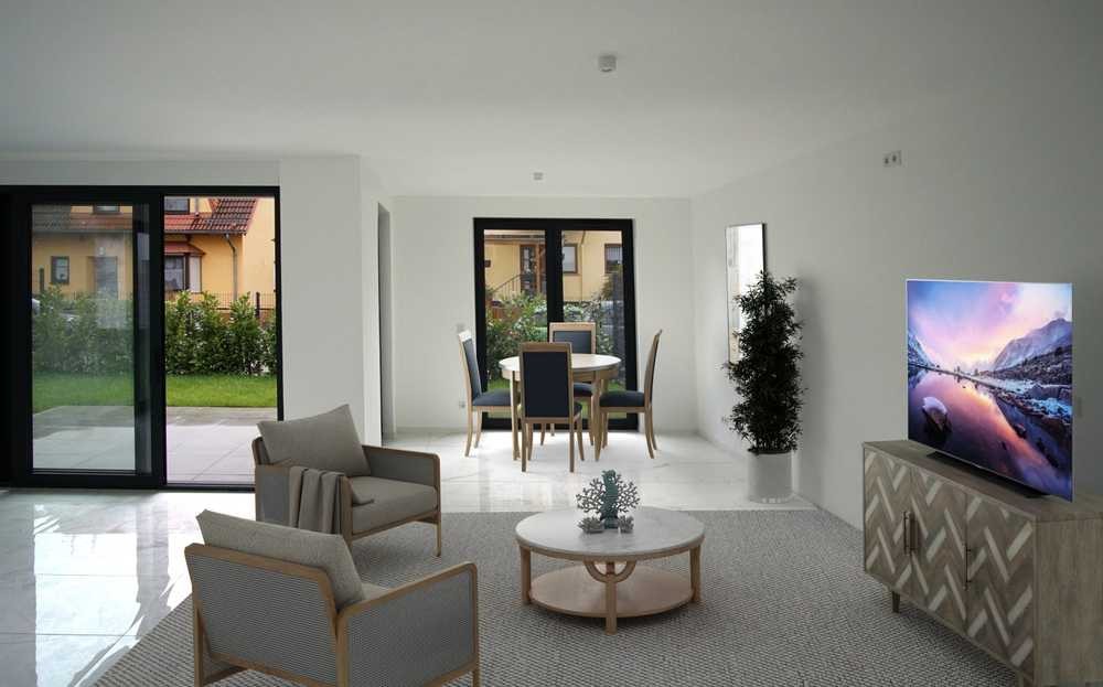 Der Wohn-Ess-Bereich mit offener moderner Einbauküche sind durch die bodentiefen Fenster und zwei Zugängen zur Terrasse und Garten lichtdurchflutet. Die Küche hat eine hochwertige Ausstattung mit Markengeräten und ist im Kaufpreis beinhaltet.