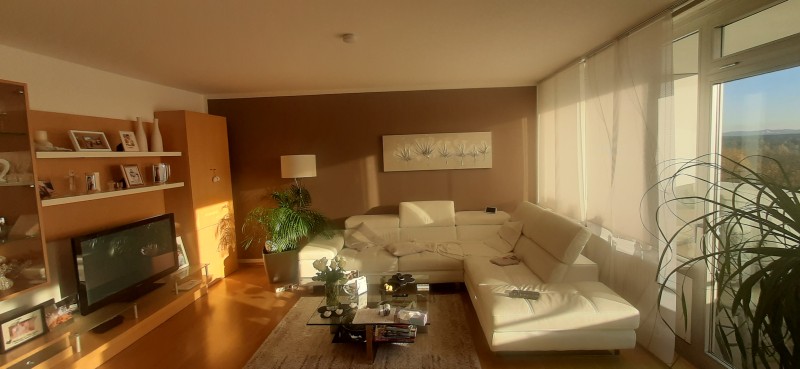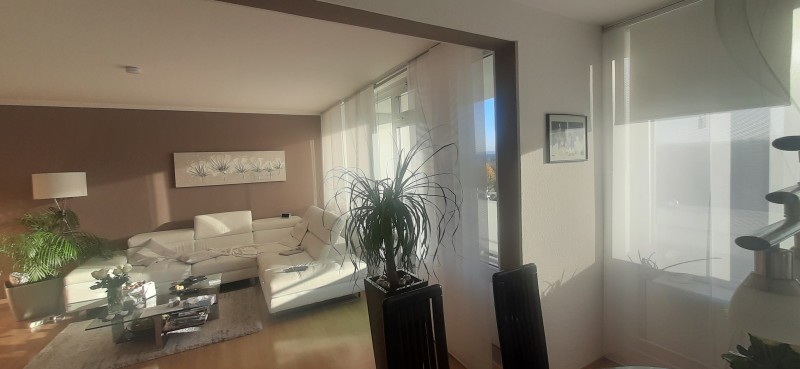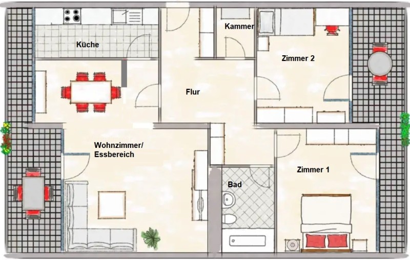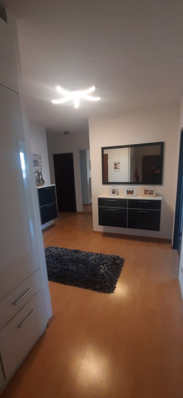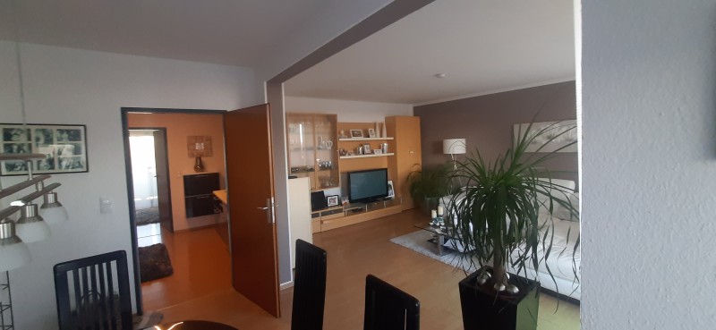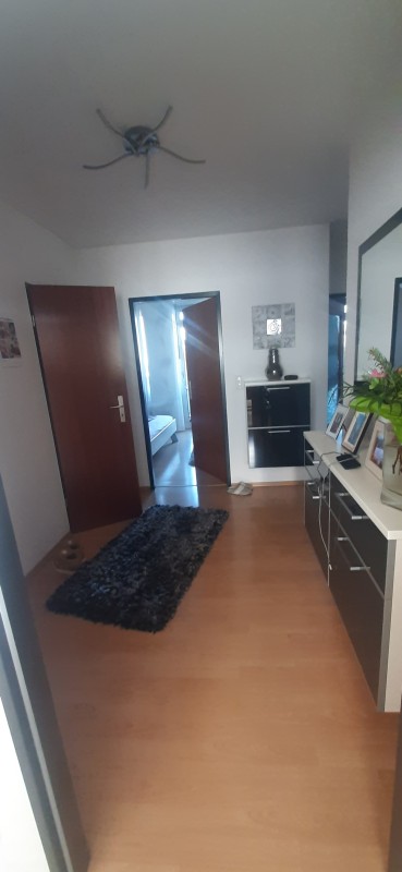 Die Wohnung besitzt 3 Zimmer (Wohn-/Esszimmer ist ein riesiger Raum + 2 Schlafzimmer) und ist sehr gut geschnitten. Von der Haustür aus erreicht man einen breiten Flur, von wo man auf der linken Seite die Schlafzimmer und das Badezimmer erreicht und auf der rechten Seite das Wohnzimmer und die Küche. Das Wohn- und Esszimmer sind räumlich nicht voneinander getrennt und bieten viel Platz. Selbst bei großen Möbelstücken wird nie eine beengte Atmosphäre erzeugt. Durch die zwei Balkone und großzügiger Auslegung der Fenster kommt zu jeder Jahreszeit sehr viel Licht in die Wohnung. Das Badezimmer wurde im Jahre 2023 modernisiert und mit hochwertigen Materialien verbaut. Die Badewanne wurde durch eine begehbare Dusche ersetzt.