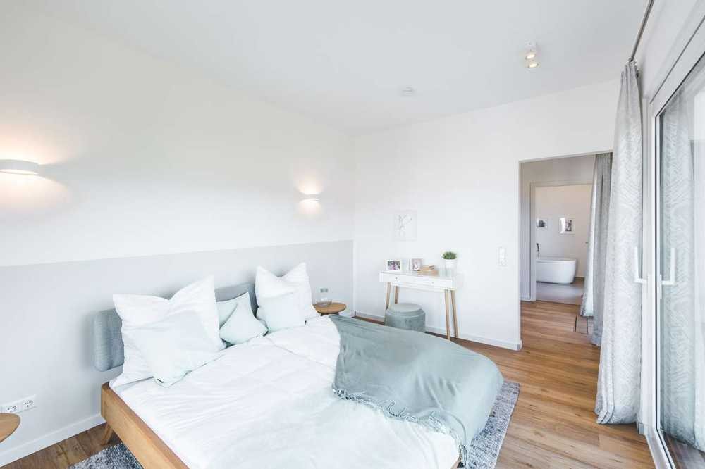 Neben dem Elternschlafzimmer können hier zwei weitere Räume als Kinderzimmer oder für Hobby und Home-Office genutzt werden. Großflächige Fenster- und Türelemente schenken den Räumen Leichtigkeit und Lichtfülle.