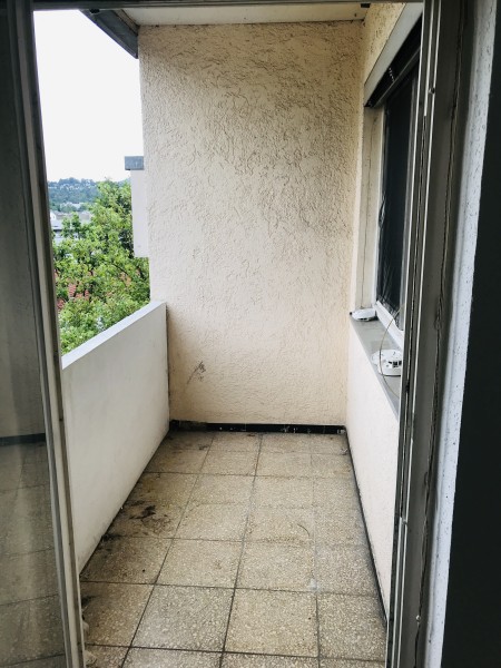 Der Balkon ist innenliegend überdacht, in der Wohnung ist helles Laminat in Buchedekor verlegt.