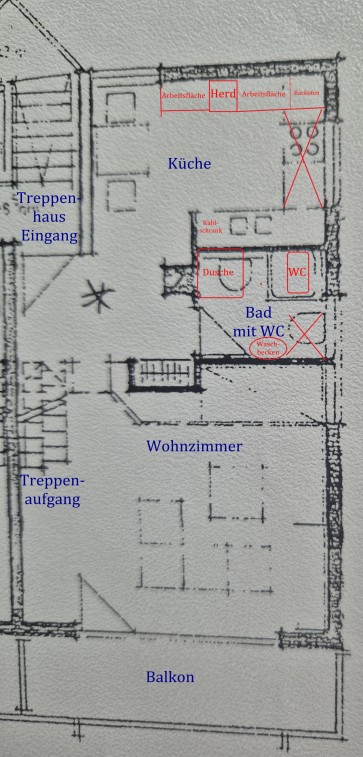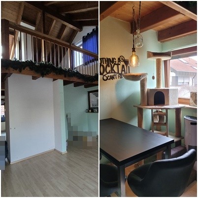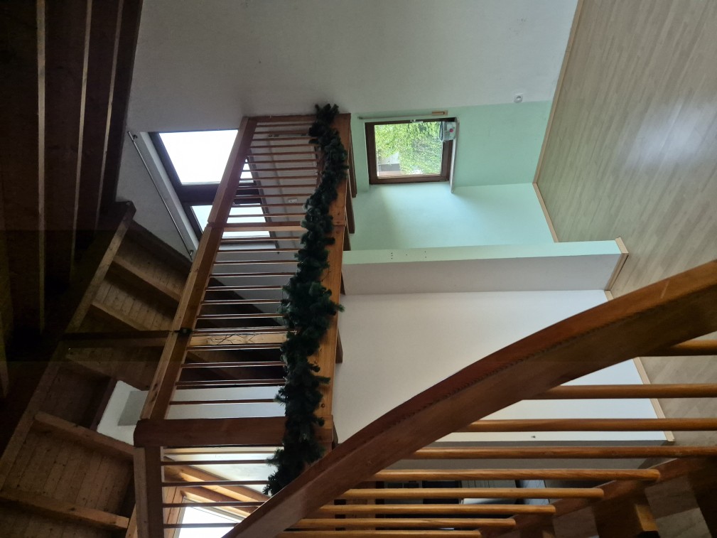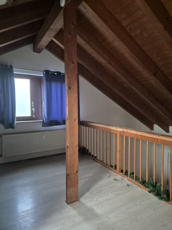 Die Wohnung glänzt durch schöne, helle Räume mit Balken und der Holzdecke, es gibt eine geräumige Küche im Landhausstil mit allen E-Geräten (Herd, Backofen rückendfreundlich angebracht, Kühlschrank, Spülmaschine, Mikrowelle). Das keine Tageslicht-Bad ist mit WC und Dusche ausgestattet. Im Flur befindet sich ein Einbauschrank. Die offene Holztreppe und der Blick auf die Galerie in ca. 4m Höhe im Wohnzimmer ist immer ein Hingucker.