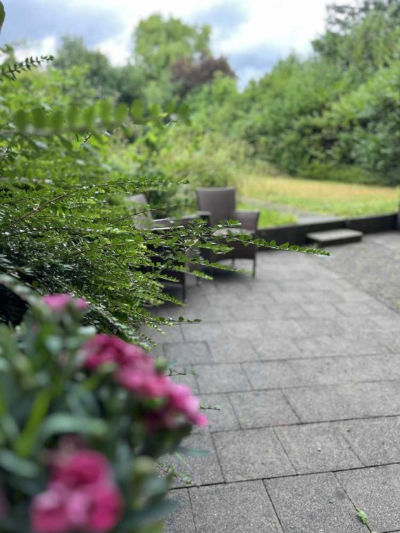 Aus den bodentiefen Fenstern im Wohnbereich hat man einen schönen Ausblick auf die Terrasse