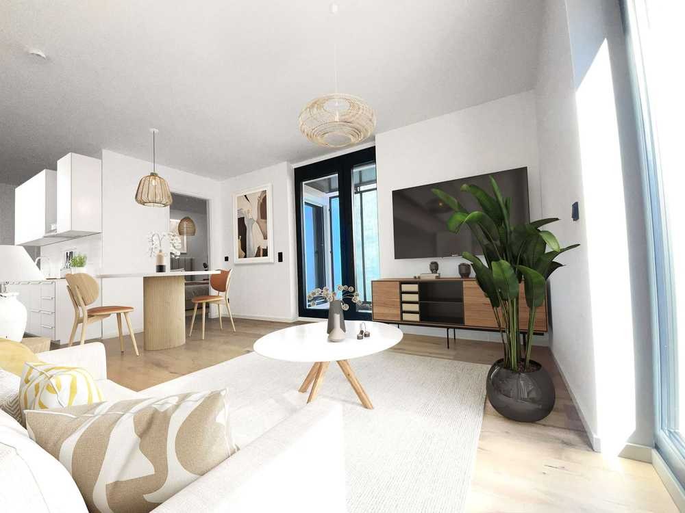 Entlang des Flurs öffnet sich der Küchenbereich mit angrenzendem Essplatz – perfekt für gemeinsames Kochen und gemütliche Mahlzeiten. Die anschließende Media-Ecke bietet Platz für ein Sofa und lädt mit dem Blick in die grüne, üppig bepflanzte Wohnanlage zum Verweilen ein.