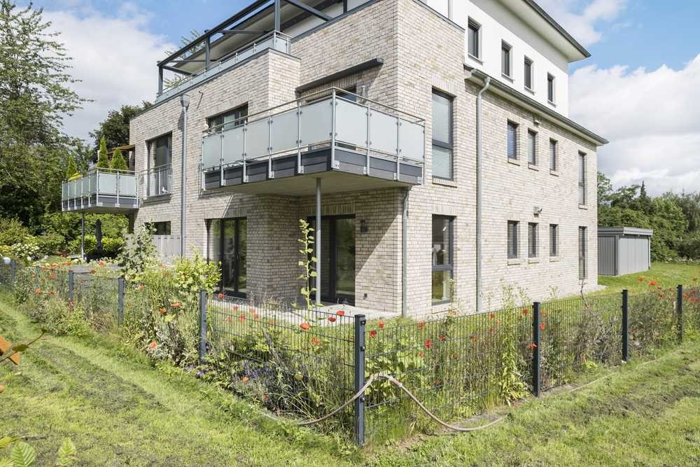 Schönes und fast neuwertiges, modernes Eigentumswohnungsprojekt mit insgesamt 5 Wohnungen, erbaut im Jahr 2021. Das Gebäude wurde mit beige/grauen Fassadensteinen und schwarzen Ziegeldachziegeln errichtet. Die Bebauung liegt am Stadtrand von Bad Malente – Gremsmühlen und grenzt fast an offene Felder.