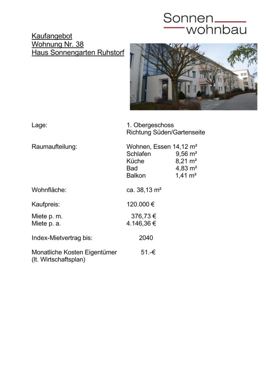 Diese Wohnung ist langfristig an eine sehr erfolgreiche Altenheim-Gesellschaft vermietet und die Laufzeit des Index-Mietvertrages, der sich jährlich analog der Inflationskosten erhöht, beträgt noch 15 Jahre bis 2040,