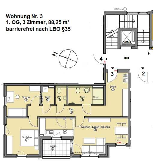 Zentral gelegen entsteht ein Mehrfamilienhaus mit 12 barrierefreien Wohnungen und einer Arztpraxis im Erdgeschoss. Ein Aufzug bringt Sie bequem von der Tiefgarage zu Ihrer Wohnung. Mit den 2- bis 3-Zimmerwohnungen von 61 m² bis 94 m² sprechen wir vor allem Singles, kleine Familien und Senioren an, die auf der Suche nach einer Eigentumswohnung sind. Das Bad ist komfortabel mit einer bodengleichen Dusche und einem Handtuchheizkörper ausgestattet. Für die Waschmaschine und den Wäschetrockner haben wir einen separaten Abstellraum in jeder Wohnung vorgesehen. Alle Wohnungen haben eine gehobene Ausstattung. Das elegante Vollholzparkett und die Fußbodenheizung sorgen für eine angenehme Wohlfühlatmosphäre. Die Fußbodenheizung lässt sich bequem über die Einzelraumregulierung steuern. Die 3-fach verglasten Fenster, teilweise bodentief, sind mit elektrischen Rollläden versehen. Eine Wohnungssprechstelle inklusiv Monitor ist im Flur untergebracht. Jede Wohnung verfügt über einen Balkon bzw. eine Loggia oder eine Dachterrasse. In der Tiefgarage stehen 17 Stellplätze mit jeweils einer 11 kW-Wallbox zur Verfügung, die von einem Lastmanagement gesteuert wird. Das Mehrfamilienhaus wird durch eine effiziente Luft-Wasser-Wärmepumpe mit tempertaturabhängiger Steuerung versorgt. Auf dem Dach befindet sich die PhotovoltaikAnlage, welche große Teile des Strombedarfs der Wärmepumpe und des Allgemeinbereiches abdeckt. Auf die Kleinsten wartet der Spielplatz mit verschiedenen Spielangeboten. Für weitere ausführliche Informationen besuchen Sie unsere Homepage https://korntalerbau.de oder vereinbaren Sie bei Interesse telefonisch unter 0711 834525 einen Beratungstermin „Rund um das Objekt“. Leben Sie Ihren Traum in Ihren eigenen vier Wänden! Alle Pläne sind nicht zur Maßentnahme geeignet. Die Grundrisse zeigen Einrichtungsbeispiele. Trotz sorgfältiger Aufarbeitung und regelmäßiger Prüfung der Daten und Unterlagen übernehmen wir keine Haftung für die Richtigkeit der Angaben. Sämtliche Darstellungen sind unverbindlich. Die Möblierung dient lediglich als Veranschaulichung