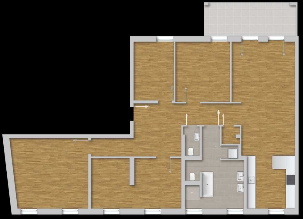 Der Wohnungsgrundriss zeigt eine modern geschnittene 5-Zimmer-Wohnung mit Tageslicht Dusch-und Wannenbad, in welchem ein separater Hauswirtschaftsbereich abgetrennt ist, vier Schlafzimmer, einen offenen Wohn- Ess- und Kochbereich, ein Gäste-WC sowie zum Innenhof hin eine Terrasse. Sehr charmant sind in dieser Wohnung die hohen Decken, welche gut 3,80 m messen.