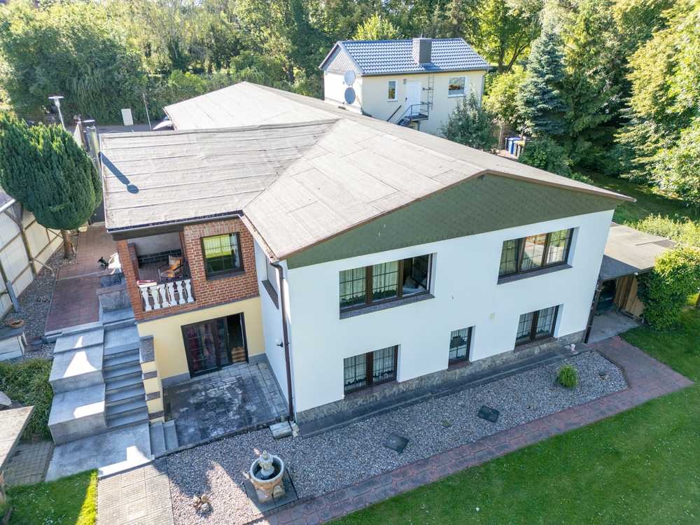 Die großzügige Hauptwohnung erstreckt sich über ca. 204 m² und bietet 5 Zimmer auf zwei Etagen, einen Kaminofen, eine Terrasse und einen Balkon. Zusätzlich verfügt sie über einen Flur, eine Küche mit Einbauküche, ein Vollbad und ein Duschbad, ein Gäste-WC und ein weiteres WC,