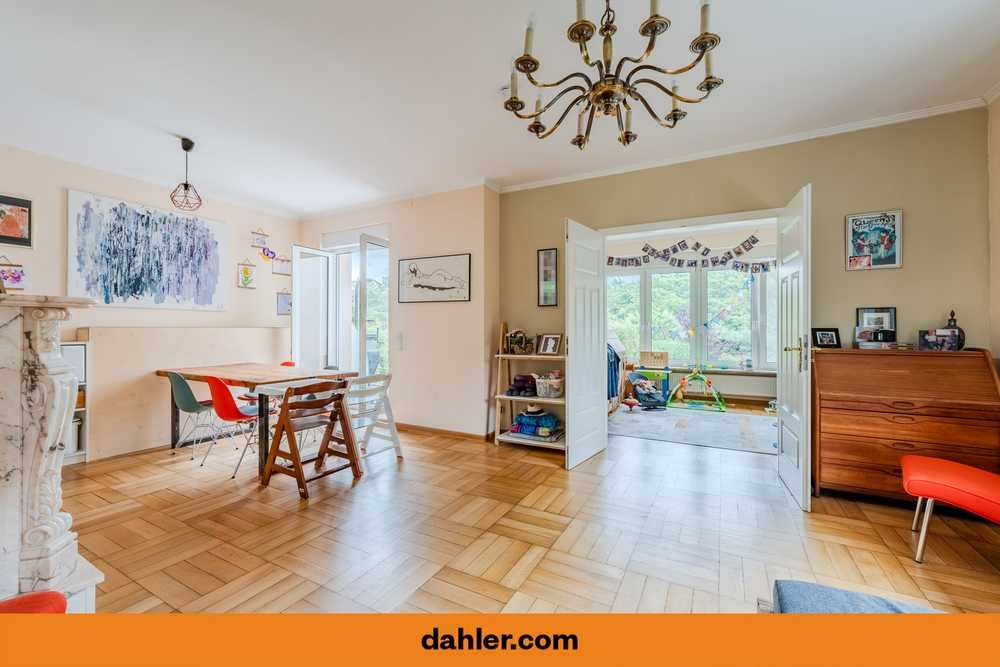 The spacious living and dining area of the apartment opens up. At 45 m², it forms the heart of the apartment. The fireplace offers you a cozy atmosphere and pleasant warmth even in the colder months. In the summer months, the terrace, which leads directly into the garden, awaits you. The garden, which is subject to special usage rights, offers a private oasis of peace and relaxation. Two bedrooms are also accessible from the living area. One has an idyllic view of the garden and the green surroundings.
