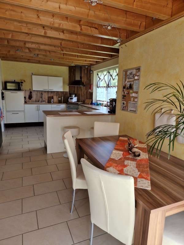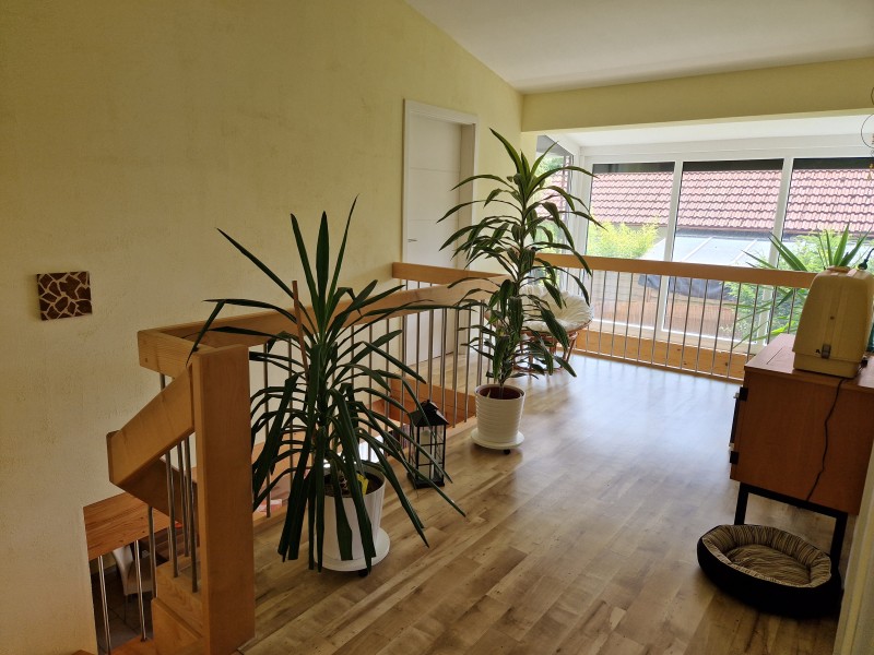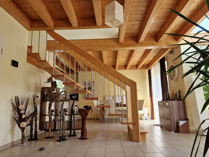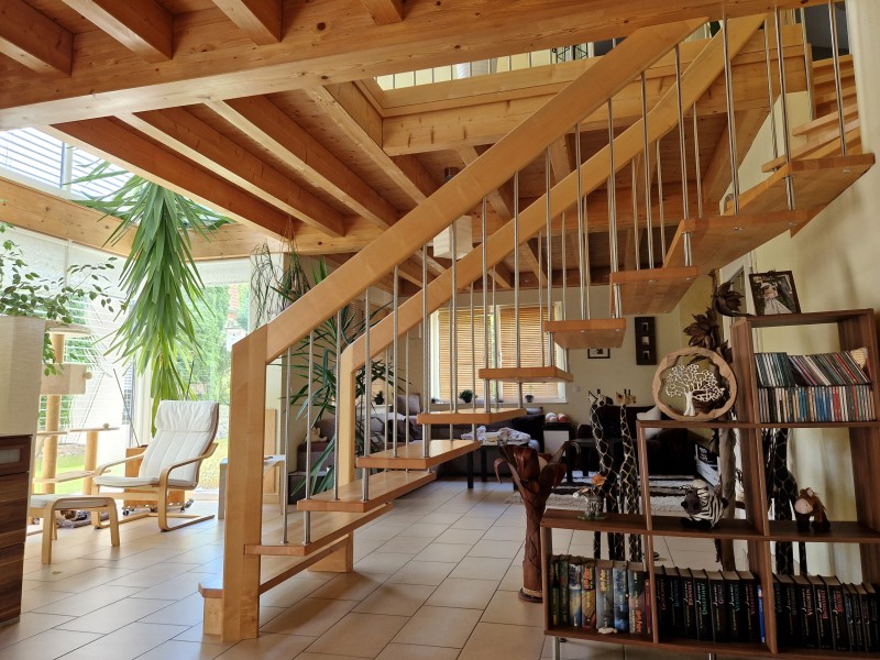 Das Haus zeichnet sich durch seine offene Holzbalkendecke sowie der frei tragenden Holztreppe im großen Wohnessbereich und 2 geschossigem Wintergarten aus. Alles hell und freundlich gestaltet. Viel Tageslicht.