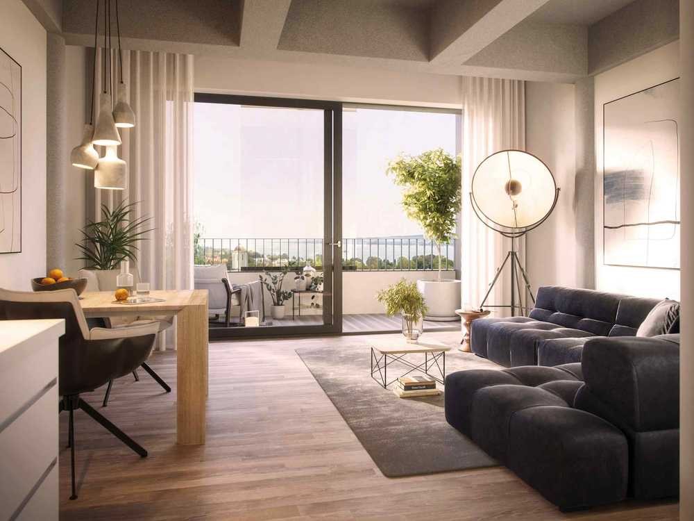 Die hohen Innenräume werden zu modernen Lofts mit offenen Wohnbereichen ausgebaut. Somit bleibt die Grundstruktur des Gebäudes mit seinen runden Betonstützen und Decken mit offenen Unterzügen erhalten – dies gibt den Räumen durch ihre Weite eine besondere Wirkung. Großzügige Fensterfronten lassen das Tageslicht in die Räume strömen und schaffen ein Zuhause mit Offenheit, Helligkeit und einer wertigen Innenausstattung. Die geschwungenen Balkone erweitern den Wohnbereich nach außen und können größtenteils mit einer Schiebeverglasung zu ca. zwei Dritteln windgeschützt geschlossen werden.