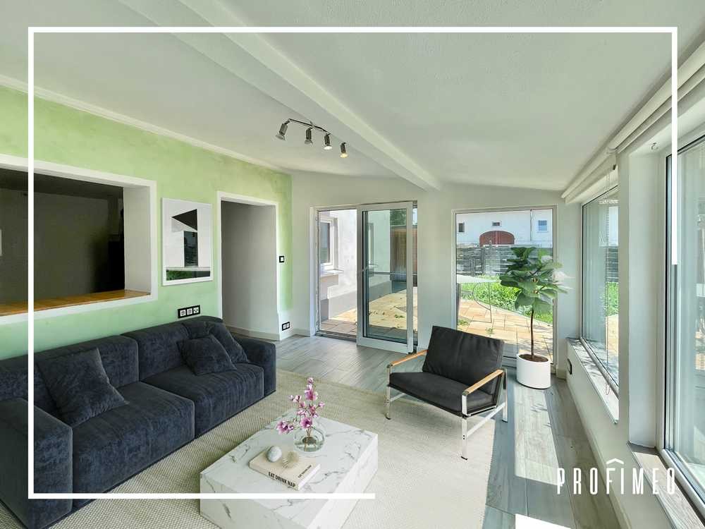 Vom Flur mit der modernen Einbauküche gelangt man in den offenen Essbereich. Hier sorgt ein praktischer Schwedenofen für ein besonderes Wohlfühlklima. An den Essbereich schließt sich der lichtdurchflutete Wintergarten an. Durch die großen Fensterfronten ist er ein sehr heller und einladender Wohnraum mit direktem Zugang zur Südterrasse mit Garten.