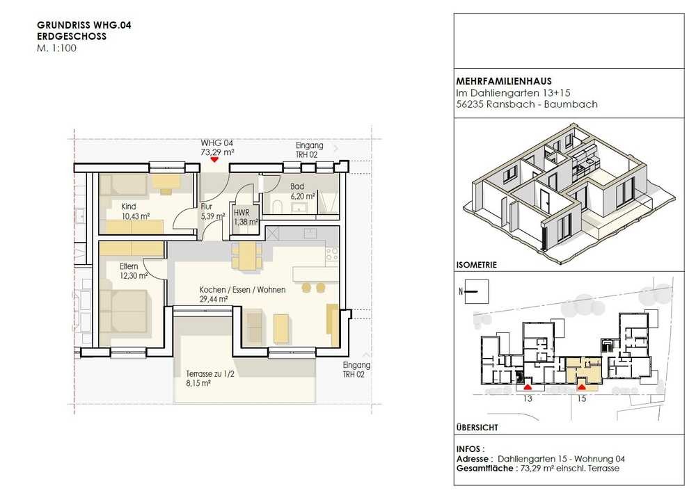 Die hier angebotene 3-Zimmer-Wohnung befindet sich im Erdgeschoss und verfügt über eine Wohnfläche von ca. 73,29 m². Vom Flur- und Eingangsbereich betreten Sie den offenen und ca. 29,44 m² großen Wohn-, Ess- und Küchenbereich mit Zugang zur einladenden Sonnenterrasse. Ebenfalls vom Flur aus betreten Sie das Elternzimmer, das Kinderzimmer sowie abschließend das Badezimmer. Ein praktischer Hauswirtschaftsraum rundet die Wohnräumlichkeiten ab.