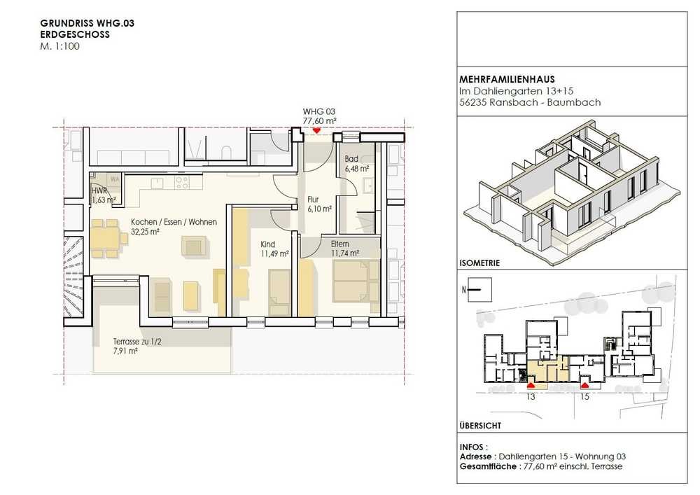 Die hier angebotene 3-Zimmer-Wohnung befindet sich im Erdgeschoss und verfügt über eine Wohnfläche von ca. 77,60 m². Vom Flur- und Eingangsbereich betreten Sie den offenen und ca. 32,25 m² großen Wohn-, Ess- und Küchenbereich mit Zugang zur einladenden Sonnenterrasse. Ebenfalls vom Flur aus betreten Sie das Elternzimmer, das Kinderzimmer sowie abschließend das Badezimmer. Ein praktischer Hauswirtschaftsraum rundet die Wohnräumlichkeiten ab.