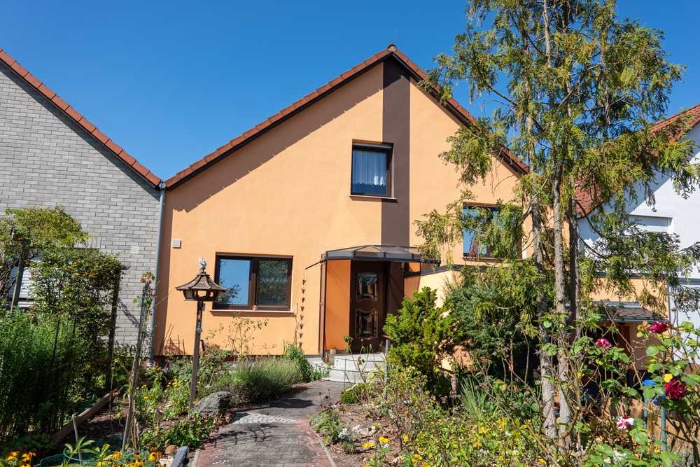 Die mit einer hochwertigen Lamellenpergola überdachte Sonnenterrasse führt direkt in den angelegten Garten. Hier befinden sich ein großes massives aus Holz gefertigtes Gartenhaus, ein Brunnenstube mit Hauswasserwerk und Obstbäume.