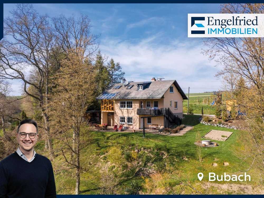 Worte können kaum beschreiben, in welch traumhafter Lage sich dieses in die Natur eingebettete Landhaus befindet. Von der Zuwegung zunächst noch unscheinbar, eröffnet sich hinter dem Gebäude ein Anblick, der – passend zur Stille – für Sprachlosigkeit sorgt. Die Geräuschkulisse setzt sich hier allenfalls aus dem Gezwitscher der Vögel, dem Plätschern des Baches und dem Rauschen des Windes in den Bäumen zusammen. Die verschiedenen Ebenen des geschmackvoll angelegten Grundstücks ermöglichen eine sinnvolle Nutzung trotz Hanglage, die doch diesen Logenplatz in erster Reihe vor malerischer Kulisse erst möglich macht. Im hinteren Bereich der Parzelle führt ein kleiner Pfad zu einer direkt angrenzenden riesigen Grünfläche. Hier möchte man wieder Kind sein und die umliegende Natur entdecken. Jede Jahreszeit wird hier vermutlich zum Schauspiel, wobei die Nutzung der Sauna im überdachten Außenbereich wohl im Winter die größte Freude bereiten wird. Das Wohnhaus wartet mit ähnlichen Besonderheiten auf. Da wäre z. B. ein Wintergarten über zwei Etagen, der mit Kaminofen und TV an der Wand in Sachen Gemütlichkeit seinesgleichen sucht. Ihre begeisterten Freunde verköstigen Sie im hellen Essbereich mit angrenzender Einbauküche im Landhausstil. Durch die stilgerechten Sprossenfenster fällt in diesen Bereich besonders viel Licht auf das rustikale Echtholzparkett. Vom angrenzenden Balkon mit Platz für den Grill führt praktischerweise eine Treppe in den Garten. Ihre Suche nach einem Traumhaus im Grünen könnte hier ein Ende haben.