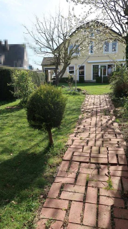 Zum Haus gehört zum einen eine Einzelgarage (mit Treppenabgang in den Keller) und die Hälfte einer angegliederten Doppelgarage inklusive drei Stellplätzen. Beide Garagen mit automatischem Garagentor und jeweils zum hinteren Ende mit einem manuellen Tor zum Garten hin.