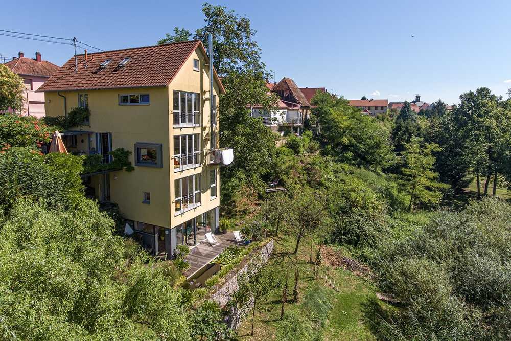 Im Jahr 2000 entstand in Seltz, nahe der deutsch-französischen Grenze dieses moderne Wohnhaus am Hang mit einer spektakulären Aussicht in die Natur.