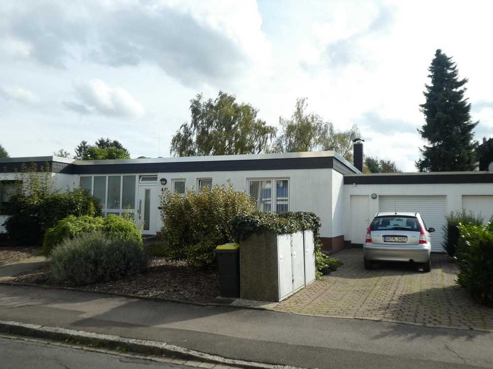 Der einseitig angebaute eingeschossige Bungalow wurde ca. 1965 in massiver Bauweise mit einem Flachdach errichtet. Im Jahr 2019 erhielt die Dachfläche eine umfassende Sanierung inkl. Gefälledämmung. Der Baukörper ist weitestgehend unterkellert und verfügt über eine mit einem Wärmedämmputz verkleidete Fassade. Das Haus an der Gartenseite wurde ca. 1997 um einen ca. 25 m² großen beheizten Wintergarten erweitert. Neben dem Gebäude steht eine Einzelgarage. An diese schließt sich ein Büroraum an, welcher durch das Haus zu erreichen ist.