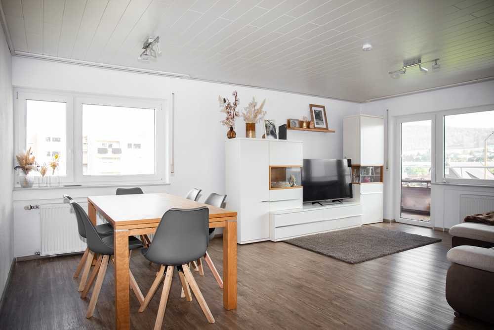 Das geräumige Wohn- und Esszimmer bildet den zentralen Bereit der Wohnung. Durch seine großen Fenster ist der Raum lichtdurchflutet und bietet viel Platz für eine gemütliche Wohnlandschaft sowie einen Essbereich. Angrenzend befindet sich die Küche mit stilvoller Einbauküche.