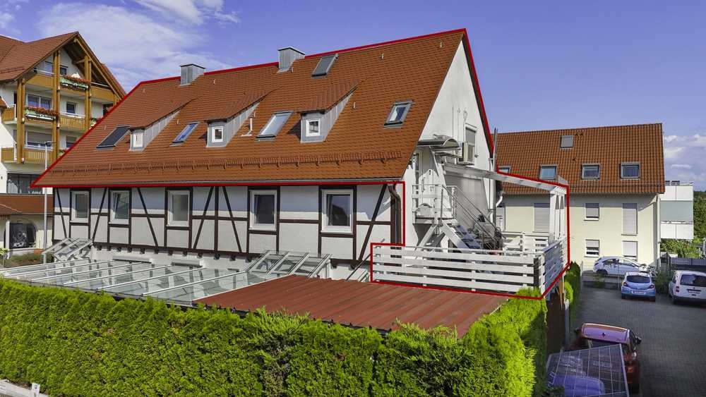 Im Herzen des Friedrichshafener Stadtteils Schnetzenhausen erwartet Sie diese charmante 4-Zimmer-Wohnung, mit eigener Süd-West ausgerichteten Sonnenterrasse, in einem liebevoll sanierten Fachwerkhaus. Das historische Gebäude wurde 2012 in drei Wohneinheiten aufgeteilt und in den letzten Jahren umfassend erneuert, sodass es modernen Wohnkomfort mit dem besonderen Flair eines Fachwerkhauses vereint. Die Wohnung befindet sich im Dachgeschoss und wurde 2012 ausgebaut. Sie besticht durch das freigelegte Gebälk, welches der gesamten Wohnung eine außergewöhnliche Atmosphäre verleiht. Über eine eigene, zum Teil überdachte Terrasse, führen wenige Stufen direkt zum Wohnungseingang. Von hier aus betreten Sie einen großzügigen Eingangsbereich, der in einen vom Rest der