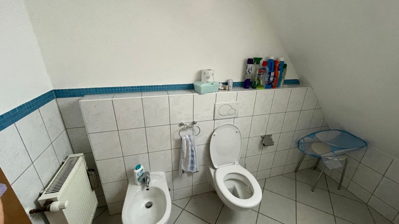Obergeschoss (OG): Normales Bad, voll ausgestattete Küche (muss ggf. entsorgt/verkauft werden), gemütliches Wohnzimmer, Abstellraum und Diele. Balkon von der Küche aus zugänglich.