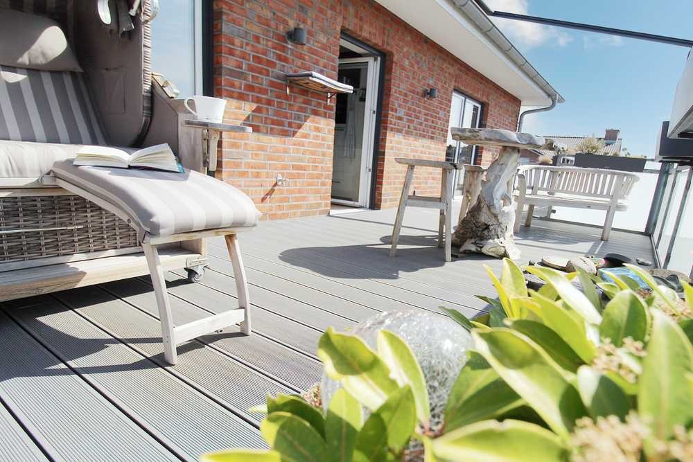Das absolute Highlight des Penthouses ist die umlaufende, ca. 110 m² große Dachterrasse mit erhöhter Teilverglasung und einer elektrischen Markise von 2 x 6 m, die auf der Süd- West Seite vor Sonne und leichtem Regen schützt. Die Dachterrasse ist von allen Zimmern aus zugänglich. Der Wohnbereich bietet den größten Anteil der Terrasse mit traumhaften Meerblick, perfekt für einzigartige Sommerabende. Zur Bewässerung der Pflanzen befinden sich zwei Wasseranschlüsse auf dem Balkon. Des Weiteren sind einige Außensteckdosen vorhanden.