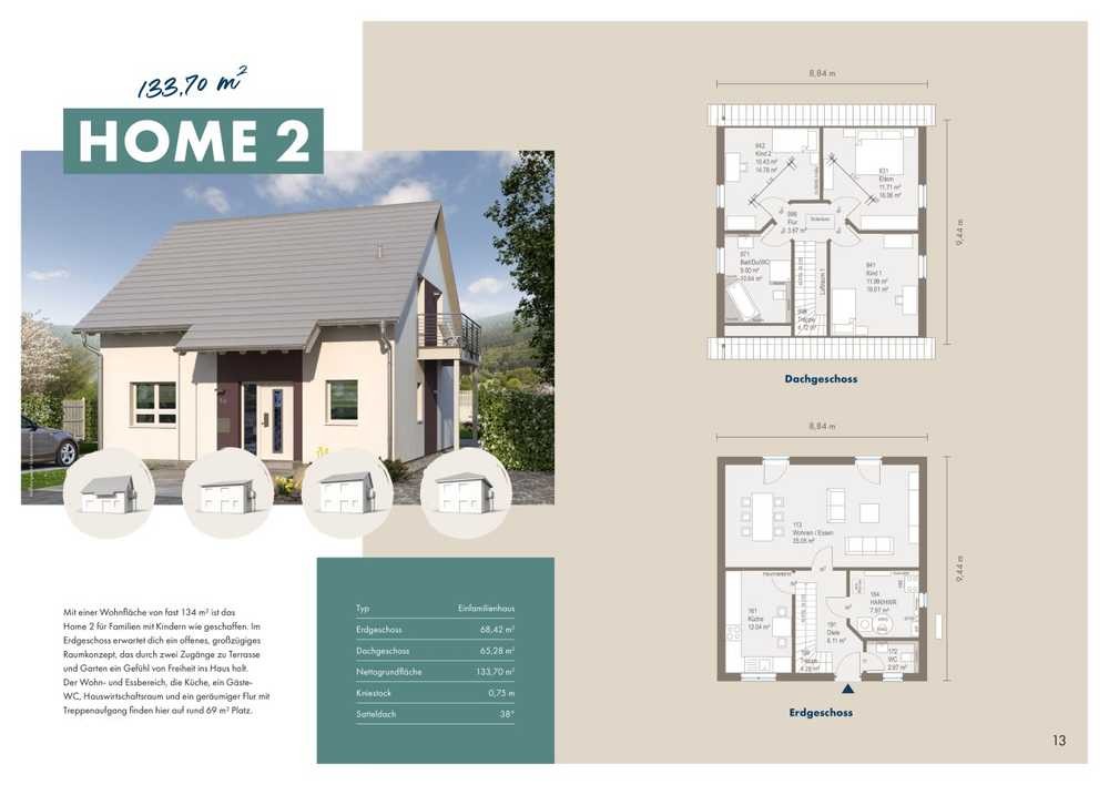 Home 2 bringt modernes Wohnen auf den Punkt. Außen klassisch, innen modernes Leben auf zwei Ebenen: Im Erdgeschoss erwartet die Familie ein offenes, großzügiges Raumkonzept welches durch zwei Zugänge zu Terrasse und Garten den Sommer ins Haus lockt. Im Dachgeschoss finden sich drei geräumige Zimmer und das lichtdurchflutete Badezimmer. Erlebt eine Raumaufteilung, die in Punkto Wohnkomfort, Variabilität und Zweckmäßigkeit keine Wünsche offen lässt. So lässt sich’s wohnen.