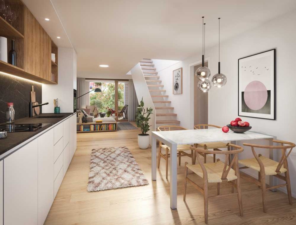 Das Stadthaus verfügt über einen eigenen Eingang. Hier zweigt direkt das Arbeitszimmer/Homeoffice ab - ideal also auch für all diejenigen, die hin und wieder Gäste im Büro erwarten und die somit künftig nicht durch den eigentlichen Wohnbereich müssen. Dieser beginnt nämlich zwei Stufen weiter oben: Mit einem großzügigen, offenen Wohn- und Essbereich samt angrenzender Westterrasse und Privatgarten, ausgerichtet zum ruhigen und intensiv begrünten Innenhof. Bodentiefe Holzfenster mit Mobiliar und imposante 3,53 Meter (!) Raumhöhe sind nur zwei weitere Highlights dieser Immobilie mit "Wow"-Faktor!