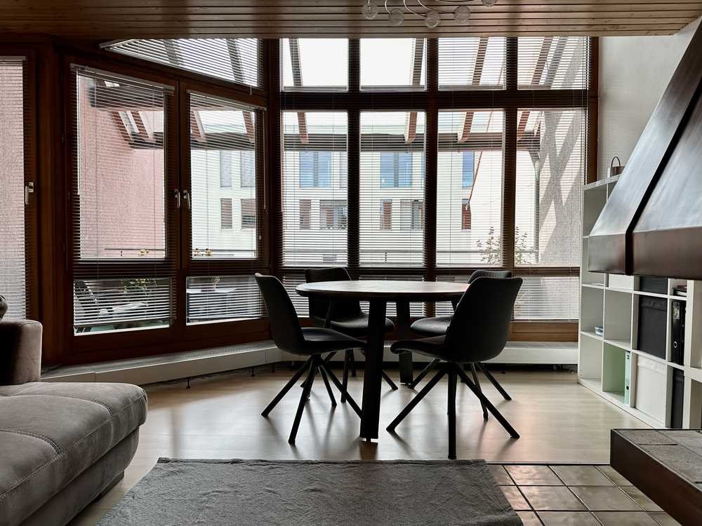 Das attraktive Wohn- und Esszimmer hat Richtung Westen eine raumhohe große Fensterfront, durch die viel Licht und Sonne in die Wohnung kommt.