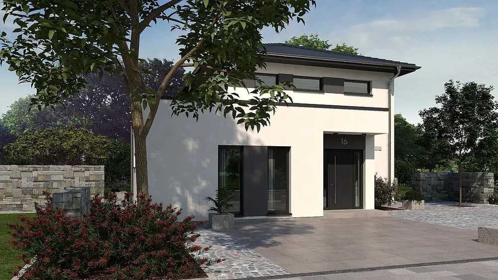 Die quadratische Walmdachvilla wird mit einem Eckanbau optisch und räumlich ergänzt. Der geschützte Eingangsbereich mit Windfang führt in die Diele. Von hier geht es in den offenen Wohn- und Essbereich mit halboffener Küche, von der ein direkter Zugang zum Außenbereich möglich ist. Außerdem befinden sich der ausgelagerte Elternbereich mit Ankleide und eigenem Duschbad sowie Hauswirtschaftsraum und Gäste-WC im Erdgeschoss. Die halbgewendelte Treppe führt in die obere Etage, wo sich eine kleine Galerie befindet. Hier haben die Kinder ihr eigenes Reich. Zwei identisch gespiegelte Zimmer sowie das geräumige Badezimmer sorgen dafür, dass der Nachwuchs sich ungestört entfalten kann.