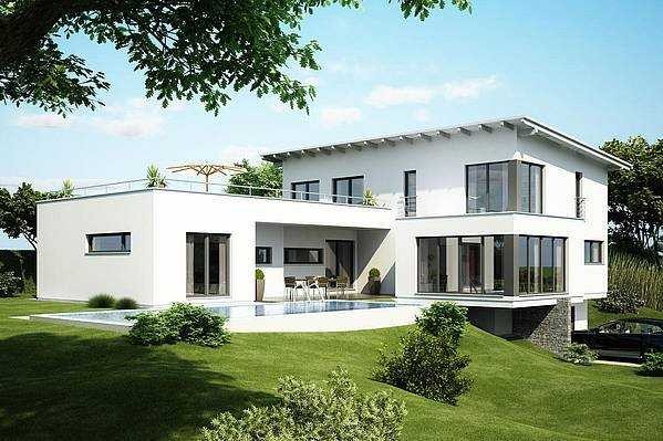 Im Zentrum dieses modernen Hauses befindet sich der Wohn- und Essbereich mit heller und offener Küche.
