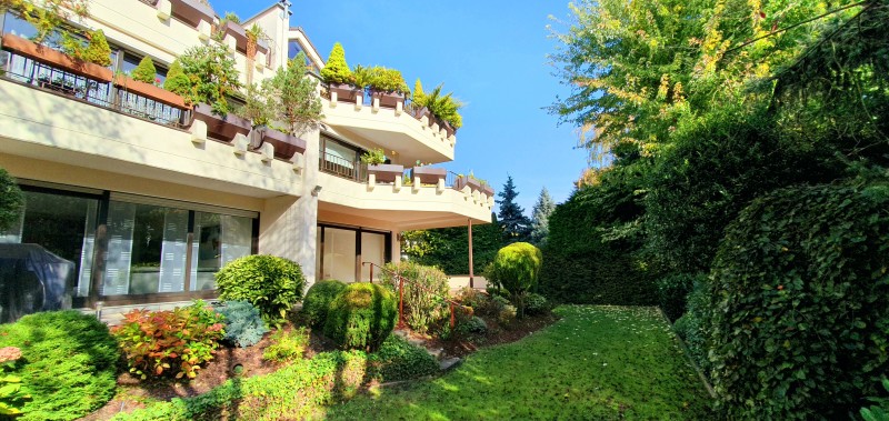 Besonders hervorzuheben sind die bodentiefen Fenster im Wohnzimmer, die wunderschöne Terrasse mit einem grünen Garten / Gartennutzung.