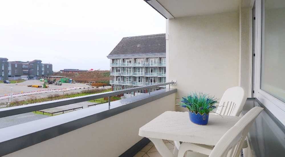 Von der Panorama-Fensterfront im Wohnzimmer blicken Sie über den Balkon auch auf die letzte Dünenkette direkt am Strand. Das Wohn-/Esszimmer ist komfortabel und freundlich eingerichtet und wirkt sehr ansprechend.