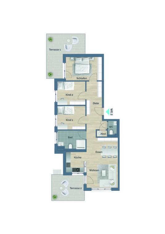 Die offene Küche ist modern gestaltet. Der angrenzende Essbereich lädt zu geselligen Mahlzeiten ein und bietet ausreichend Platz für Ihre Familie und Gäste. Zudem verfügt die Wohnung über drei gemütliche Schlafzimmer, die individuell genutzt werden können, sowie ein stilvolles Badezimmer mit einer großzügigen, begehbaren Dusche und hochwertigen Sanitäranlagen. Ein zusätzliches separates WC sowie ein praktischer Abstellraum innerhalb der Wohnung bieten Ihnen weiteren Komfort und Stauraum für Haushaltsgegenstände.