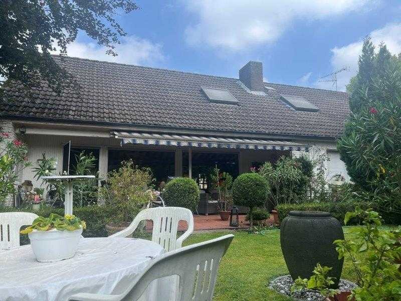 Das Erdgeschoss mit ca. 130 m² Wohnfläche bietet 5 Zimmer. Von der einladenden Diele erreichen Sie die Küche, G-WC und den großzügigen Wohn/-Essbereich mit Bodentiefenfenster zum Südgarten. Die Küche ist sowohl von der Diele aus als auch vom Esszimmer begehbar. Das Esszimmer ist bei Bedarf mit Schiebetür zum Wohnraum abzutrennen. Der separate Schlaftrakt bietet einen großen Elternschlafraum, zwei weitere Schlafräume sowie ein Badezimmer mit Tageslicht. Der große sonnenverwöhnte Garten ist liebevoll gestaltet und bietet verschiedene Sitzgelegenheiten und einen kleinen Teich. Eine gemütliche überdachte Terrasse lädt zum Verweilen ein. Auf dem Grundstück befinden sich außerdem drei Garagen und ein Gartengeräteschuppen. Die große Einfahrt bietet Stellfläche für drei PKWs.